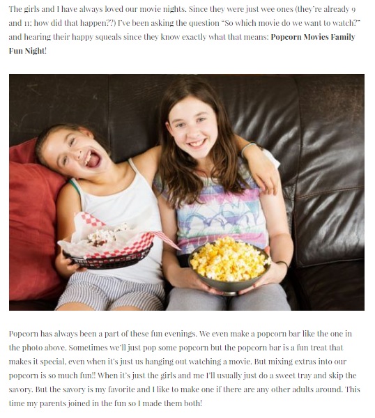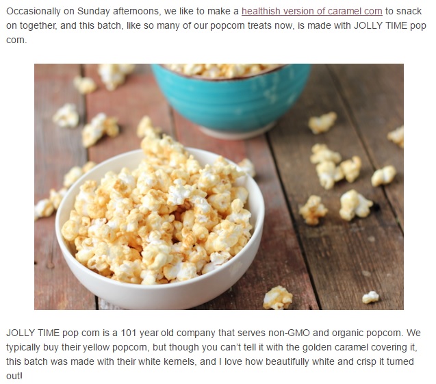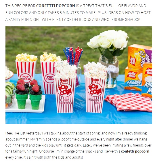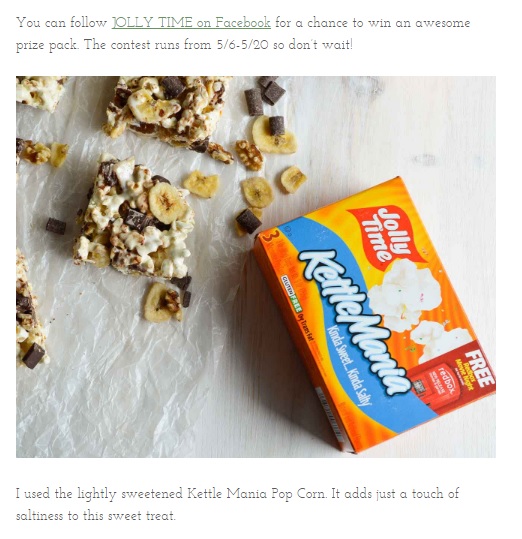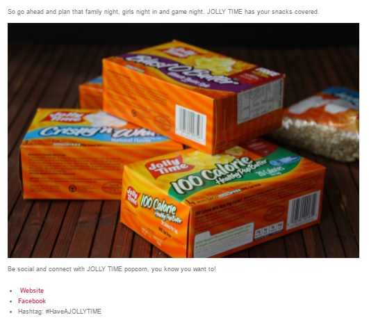 The goal of the campaign was to promote JOLLY TIME Popcorn and weave in authentic stories along with the blog posts. The posts needed to be at least 300 words in minimum, include the brand's link and the designated campaign message points. Bloggers also needed to mention the giveaway through JOLLY TIME's Facebook page.